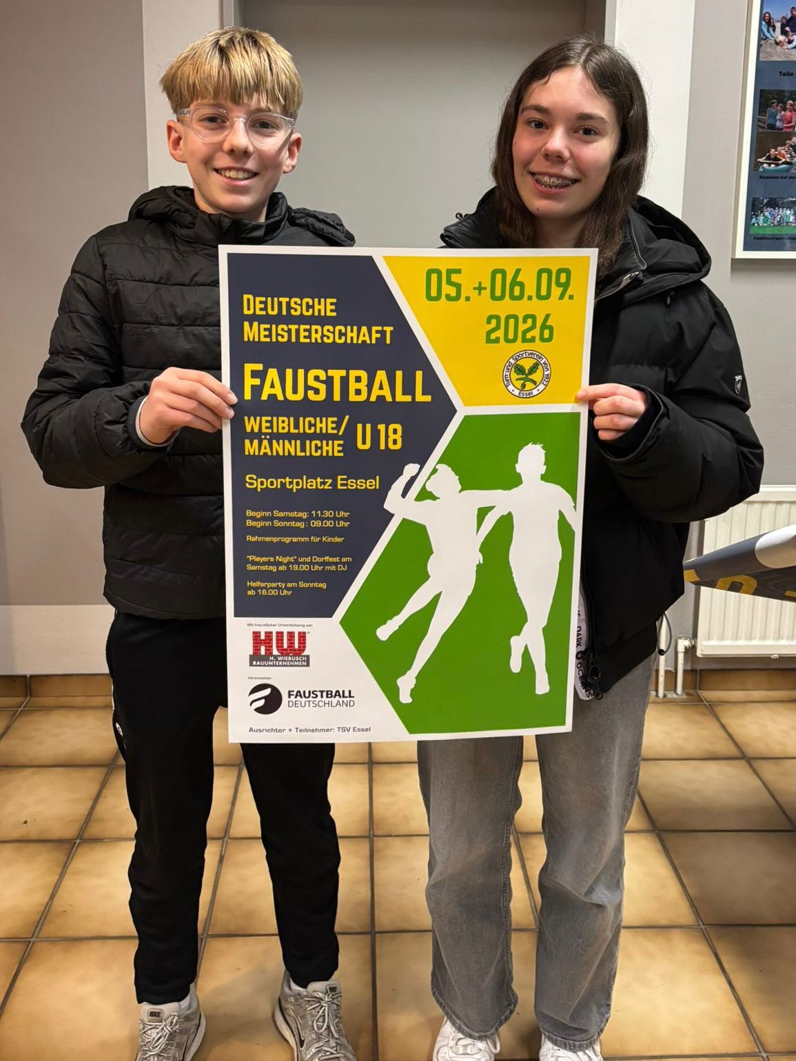 Mit großer Vorfreude auf die Deutschen Meisterschaften der weiblichen und männlichen U18 im Faustball am 05. und 06. September 2026 wurde nun das offizielle DM-Plakat vorgestellt. Stellvertretend für ihre Teams präsentierten die beiden Mittelspieler Sophie Seba und Mika Bartsch das Motiv des DM-Plakats.